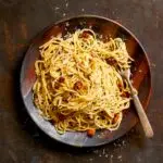 Earthy, woodsy herbs and salty pancetta, both crisped in rendered pancetta fat, infuse this simple spaghetti dish with savory depth. Parmesan cheese adds nutty, umami notes and red pepper flakes add a kick of heat, rounding everything out. Orange is a surprise ingredient in the dish. We love the muted sweetness and acidity of orange zest and juice, which nicely balance the richness of the cheese and pork. Lemon is a fine substitute.
