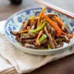 Add all the peppers and carrots and stir a few times before adding the beef back into the wok.