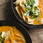This sopa de tortilla is a simple, homestyle tortilla soup like we had in Mexico. It is pureed for smoothness; contrasting colors, flavors and textures are added with garnishes. For the best results, ripe tomatoes are key—in non-summer months, we find Campari tomatoes to be a good option, as well as cherry or grape tomatoes. The tomatoes need only to be cored before they’re tossed into the pot (cherry or grape tomatoes can be used whole). Tortilla chips, called totopos in Mexico, are used in two ways: they’re cooked and pureed with the base to thicken the soup, then fresh chips are added to the serving bowls before the soup is ladled in.