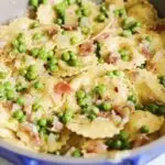 Add the frozen peas to the onion mixture followed by a ¼ cup of the ravioli water.